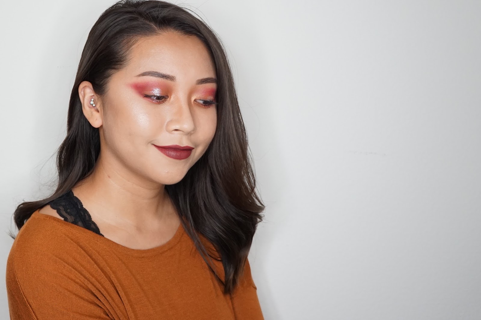 I haven't had time to play with the Kylie Cosmetics Burgundy Palette or the Makeup Forever Artist Shadow in M-846 Morello Cherry and so this seemed like the perfect opportunity to use them both! Morello Cherry was a bit hard for me to blend out because it is so pigmented. I also have a spot on above my eyes where shadows stick on weirdly though. I used Morello Cherry to create the whole shade and smoke, but used mixtures of the Kylie Cosmetics eyeshadows to do the rest. To top it off and add shine, I also used the same cream pressed glitter on my face from Memebox.